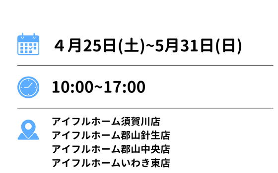 - 郡山針生店モデルハウス、郡山中央店モデルハウス、須賀川店モデルハウス、いわき東店モデルハウス