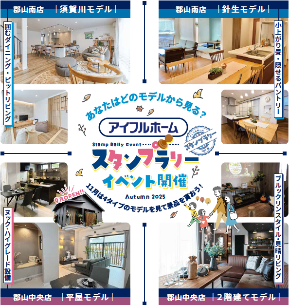 郡山市、須賀川市で4つのモデルハウスが見れます!スタンプラリー見学会開催■日時:11/1(土)~11/30(日) 10:00~17:00①アイフルホーム郡山中央店2棟②アイフルホーム郡山針生店③アイフルホーム須賀川店最寄りのモ…